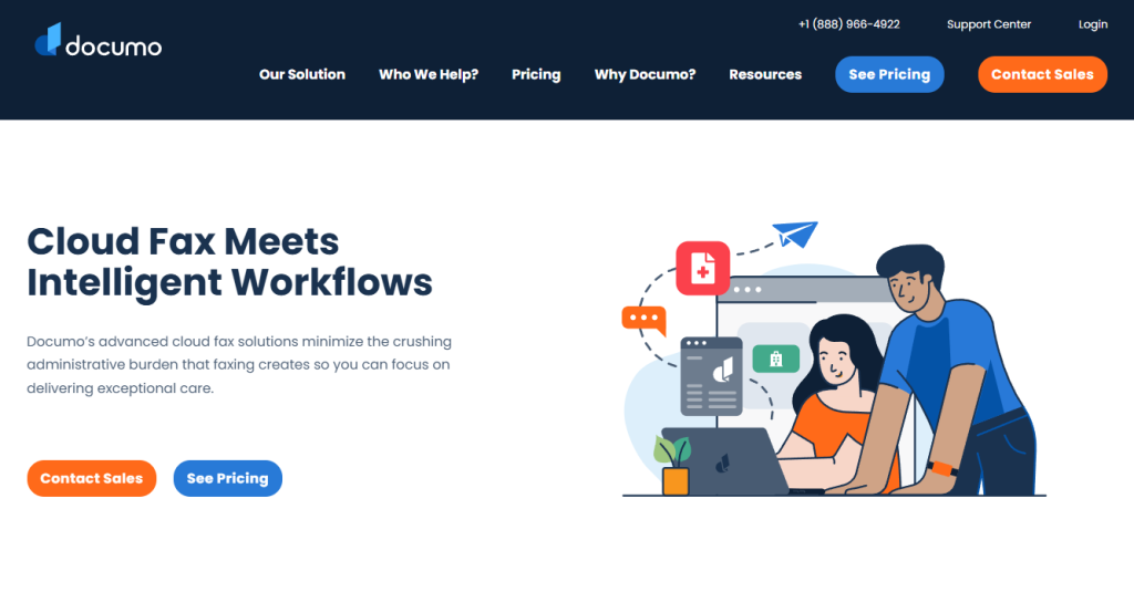 Documo is a cloud-based eFax service designed for businesses that need secure, compliant, and automated faxing. It offers HIPAA-compliant transmissions, making it an excellent choice for industries handling sensitive data. It has a robust API that you can use to integrate faxing directly into existing workflows for seamless automation.