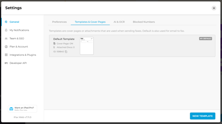 2. Under General Settings, you can update your preferences, such as the default fax quality, time zone, paper size, etc. You can also set a default cover page template under Templates & Cover Pages.